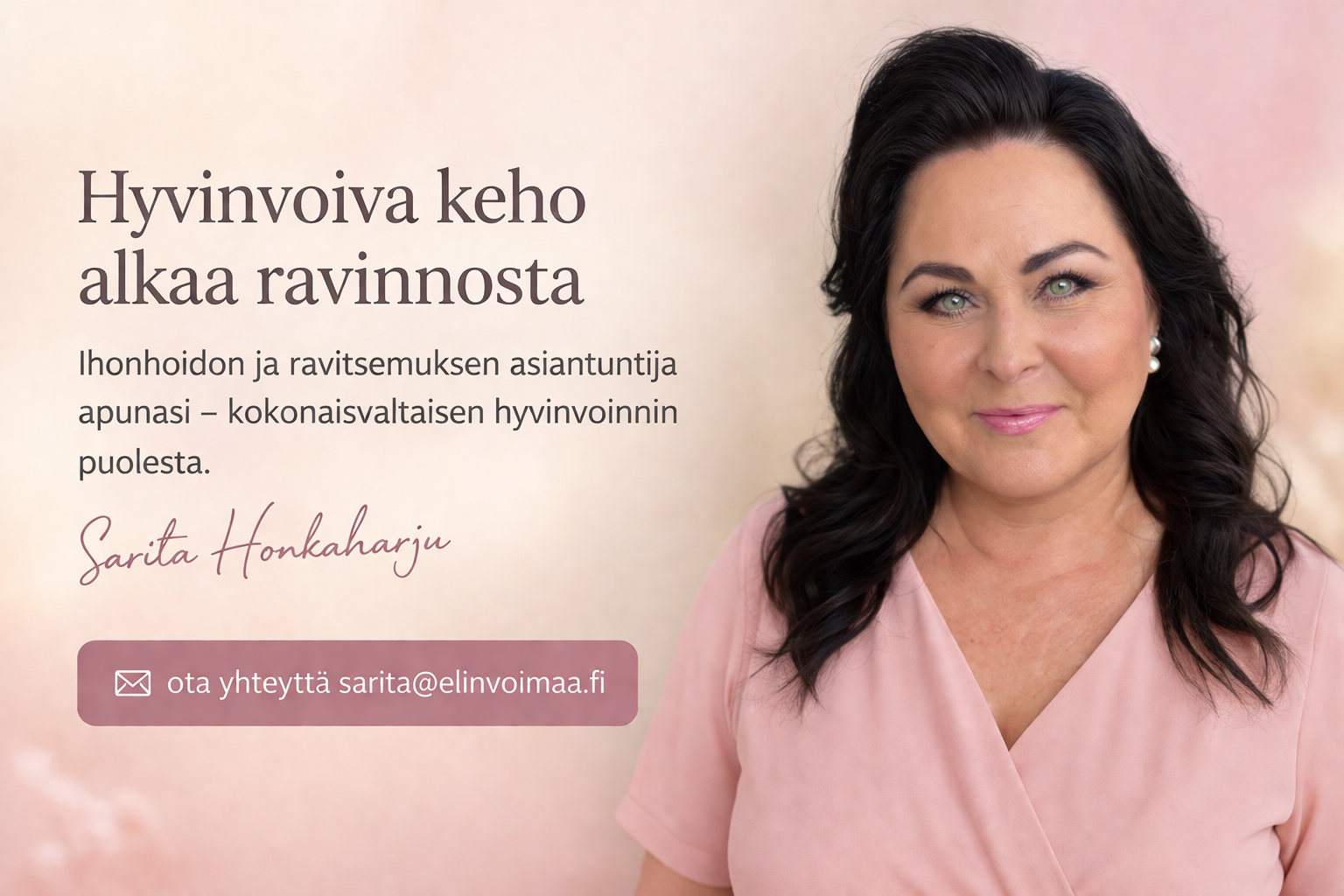 Olen Sarita Honkaharju, ihonhoidon asiantuntija, diplomikosmetologi, luontaishoidon asiantuntija ja kouluttaja.